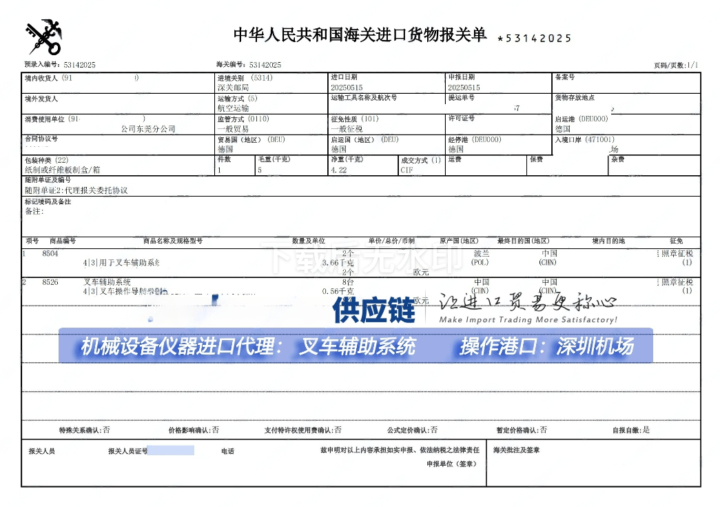 咨询:叉车辅助系统进口报关案例|机械设备仪器清关全流程指南